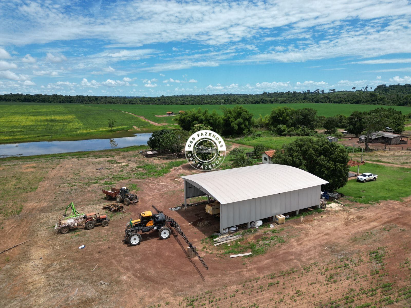 Propriedade rural em atividade de plantio de soja por toda sua extensão.